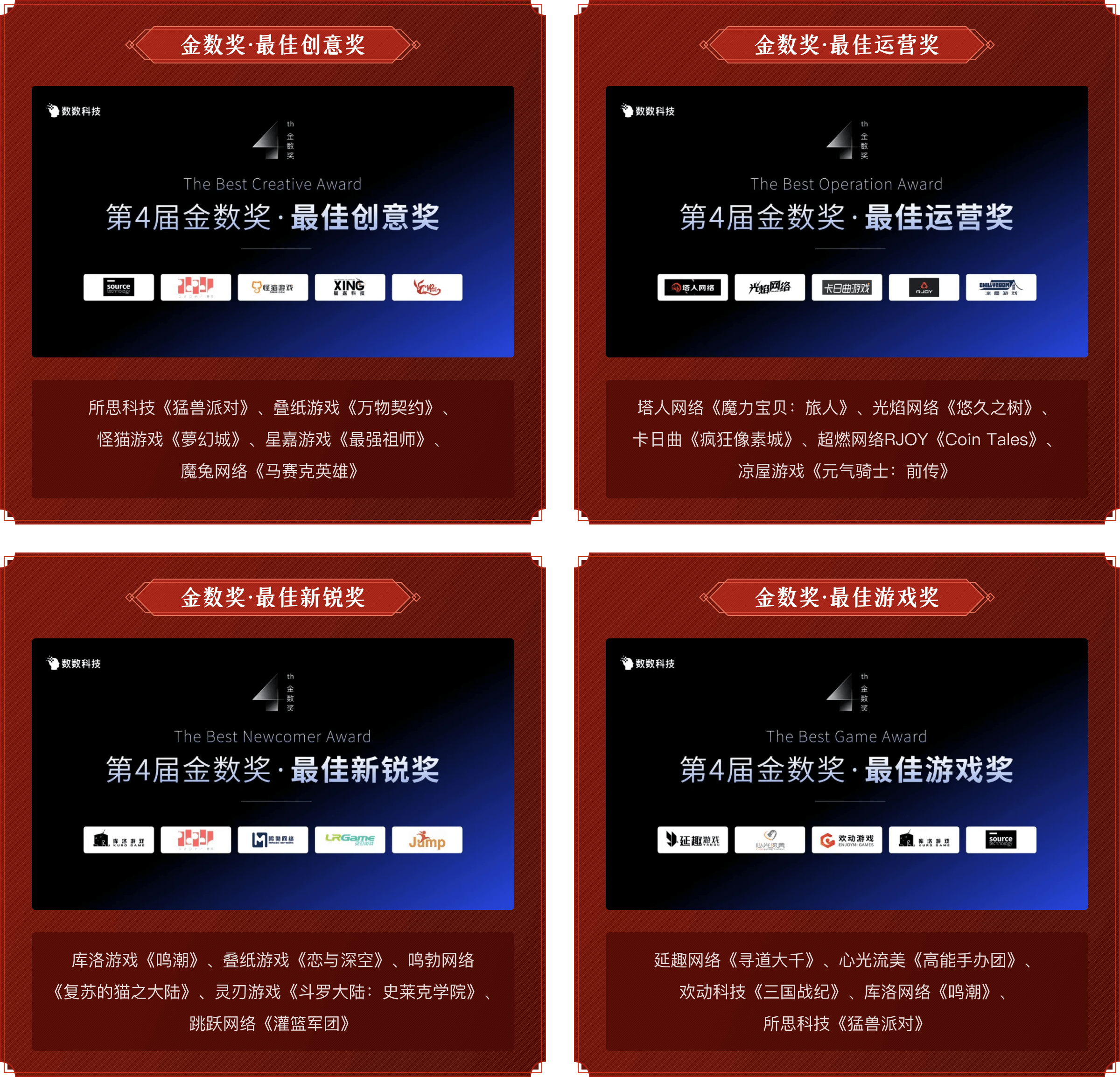 本届金数奖涵盖最佳创意奖、最佳运营奖、最佳新锐奖及最佳游戏奖,库洛、叠纸等十余家头部游戏厂商荣登本届金数奖榜单。(以下排名不分先后)